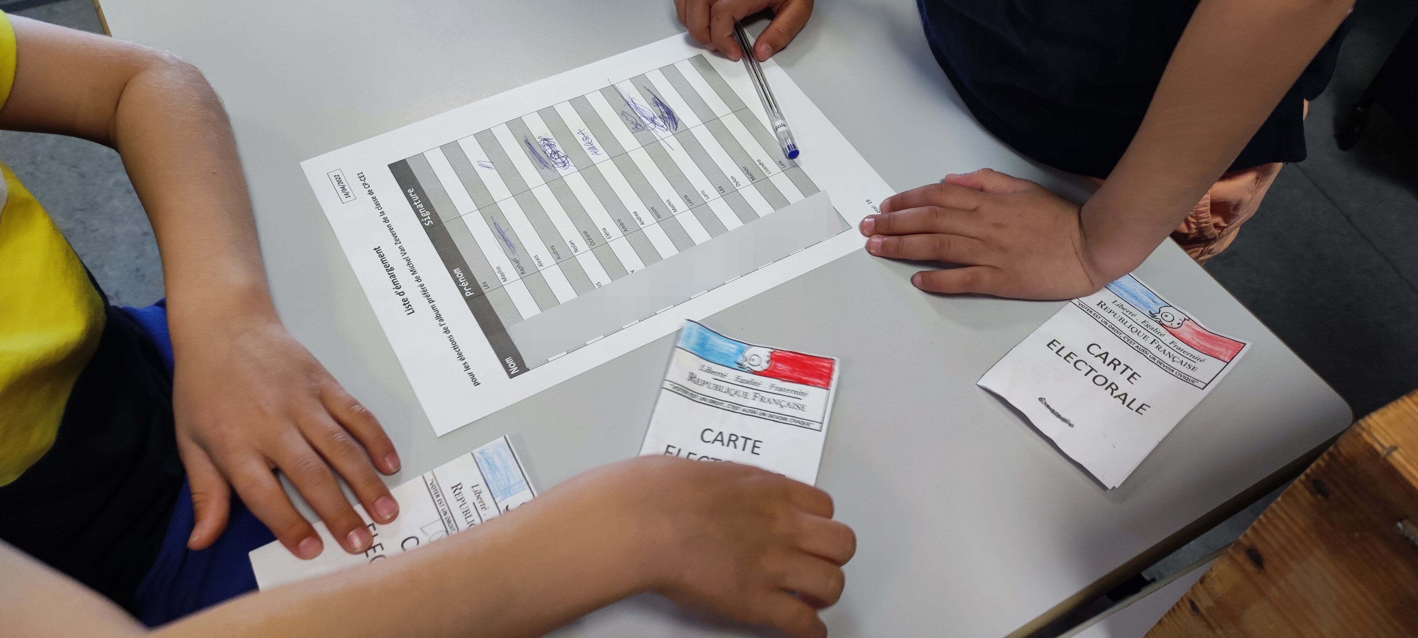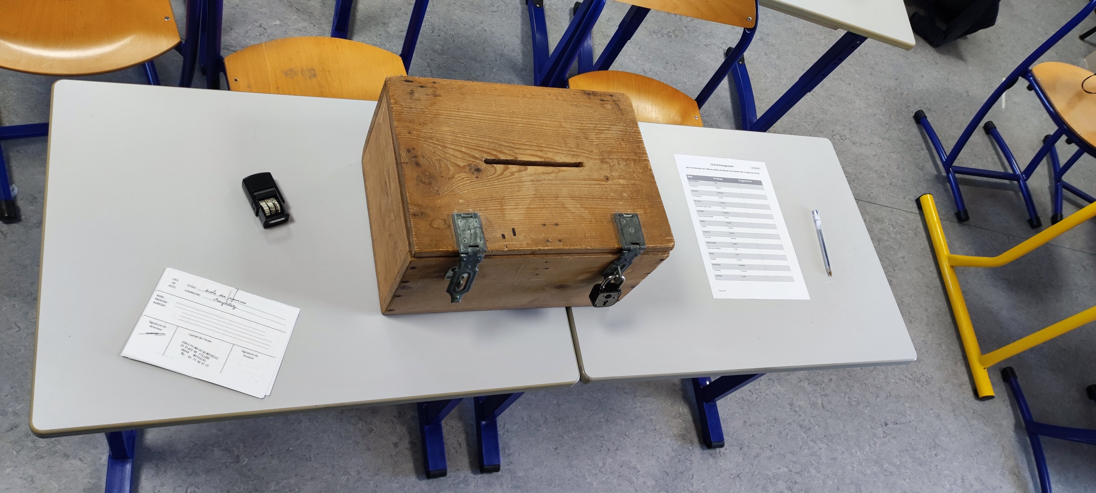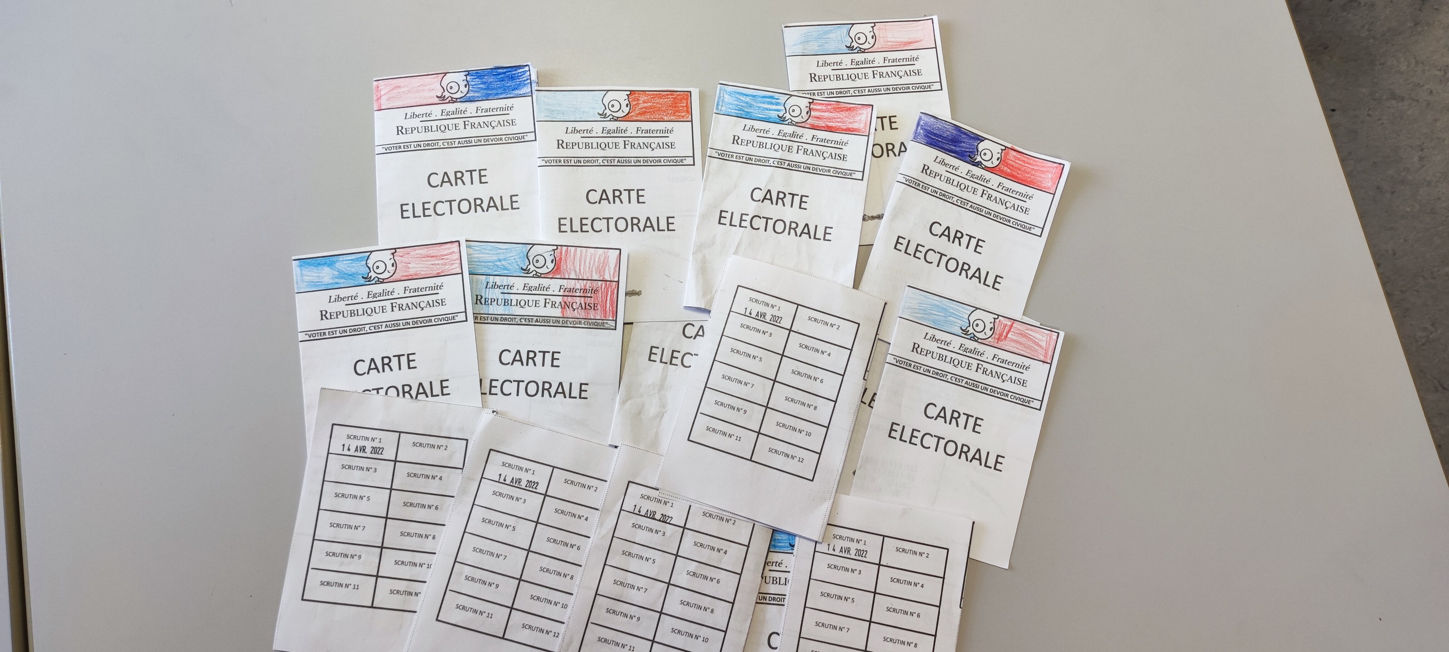 Nous avons donc tout préparé et mis en place un bureau de vote dans la classe avec les bulletins, les enveloppes, l'isoloir, l'urne, la liste d'émargement, les carte d'électeurs...