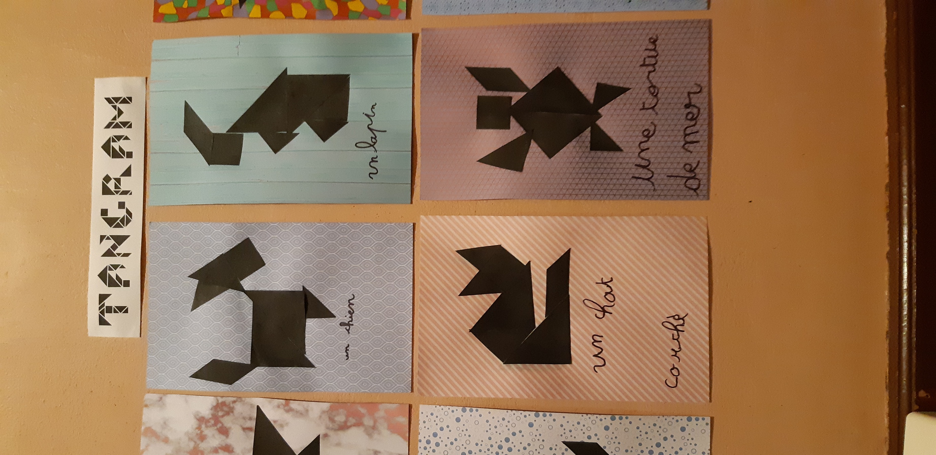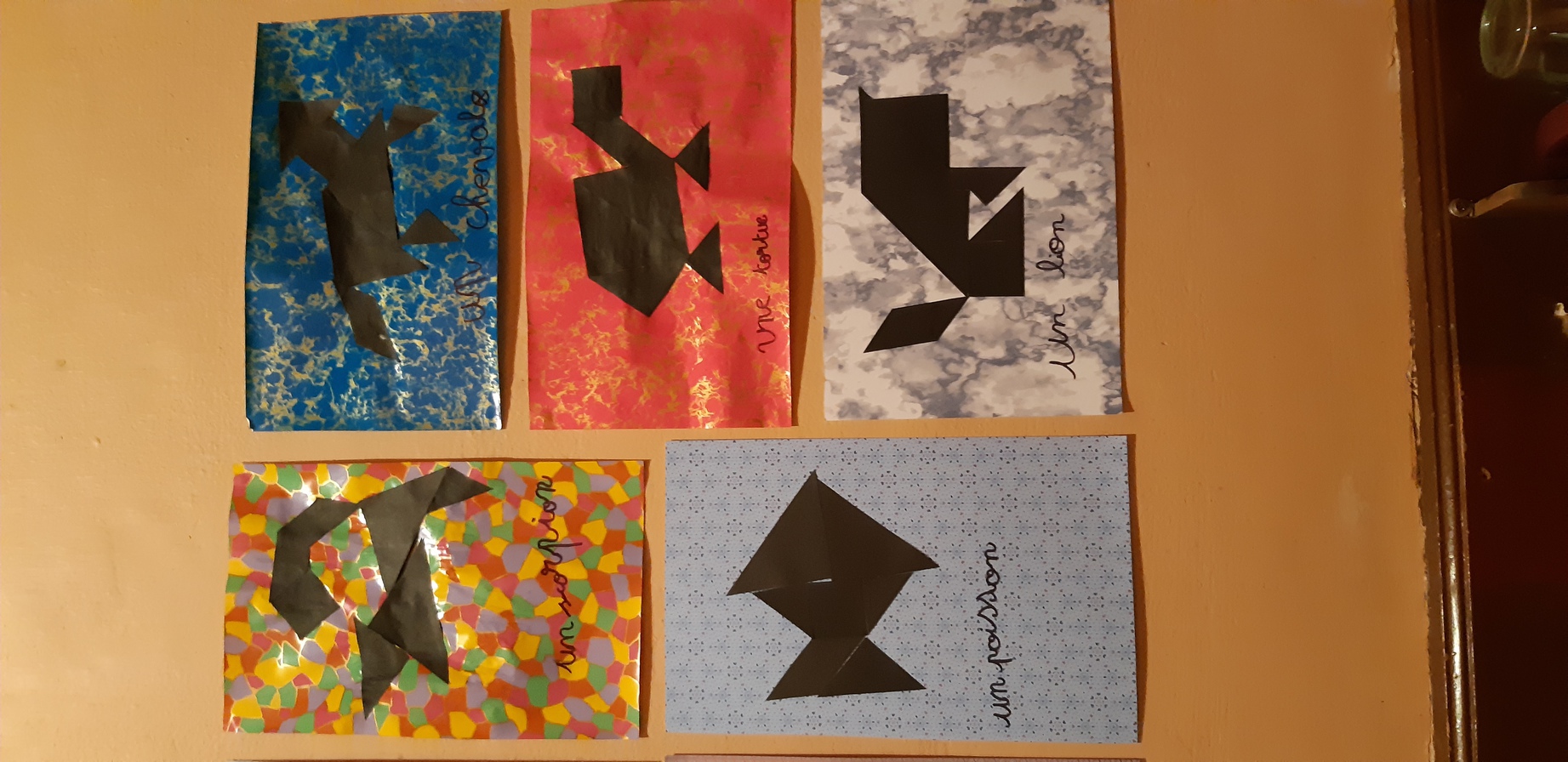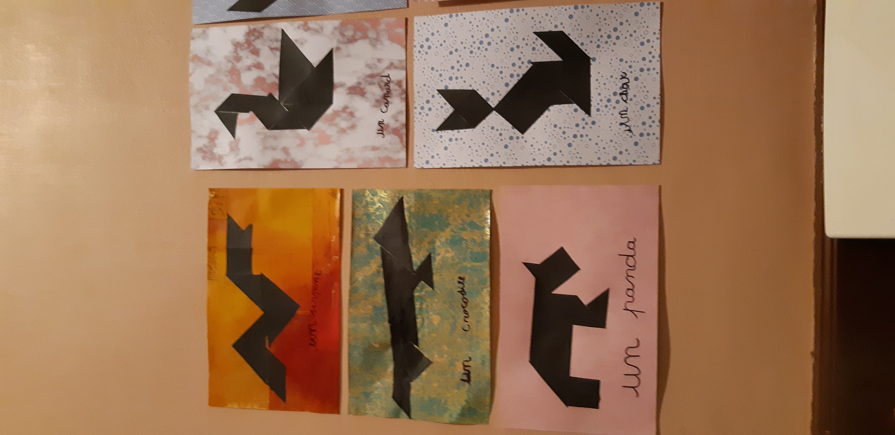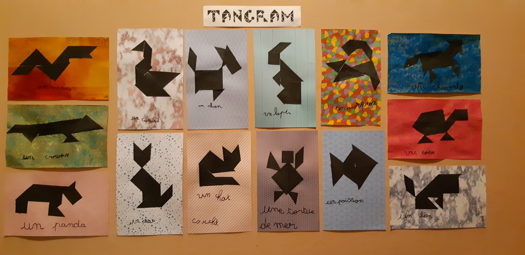 Nous avons aussi réalisé des tangrams sur le thème des animaux de manière plus "artistique" et nous les avons affichées dans le couloir de l'école.
